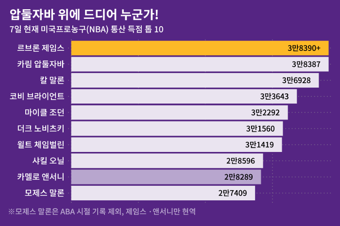 그사이 통산 득점 2~10위는 모두 바뀌었지만 이날 전까지 1위는 늘 압둘자바였습니다.