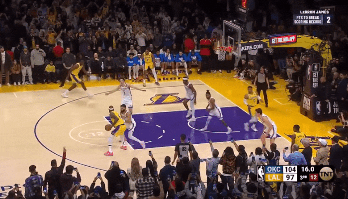 그러나 제임스는 3쿼터가 끝나기 전에 압둘자바를 넘어섰고 4쿼터 종료 1분 51초 전에도 레이업슛을 성공하면서 통산 득점을 3만8390점까지 늘렸습니다.