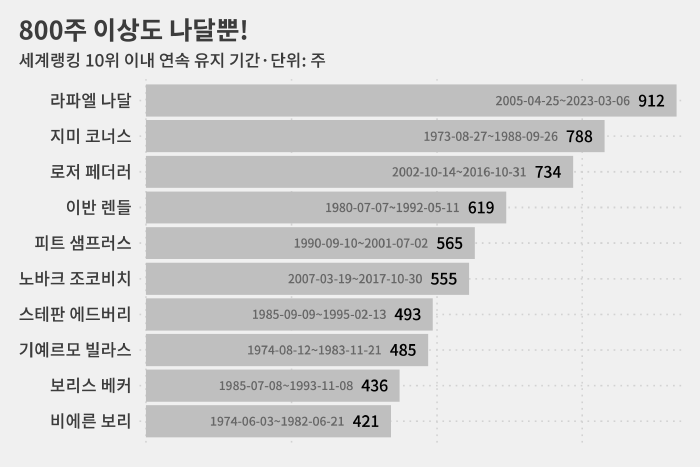 ATP 투어 역사상 이보다 오랜 기간 계속해 톱 10 자리를 지킨 선수는 없습니다.