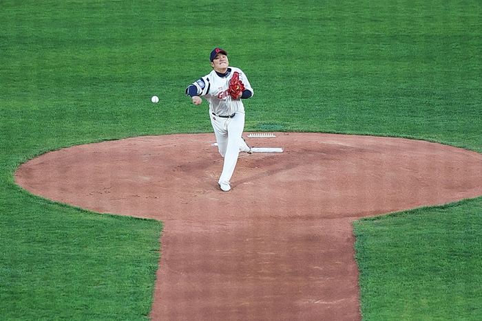 이 타구는 마운드 위에서 한 번 바운드한 다음 이 심판 몸에 맞았습니다.