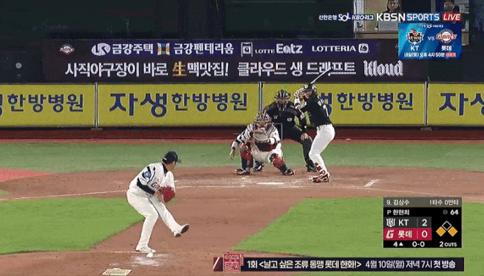 KT 9번 타자 김상수(33)가 롯데 선발 한현희(30)가 던진 초구를 받아쳤습니다.