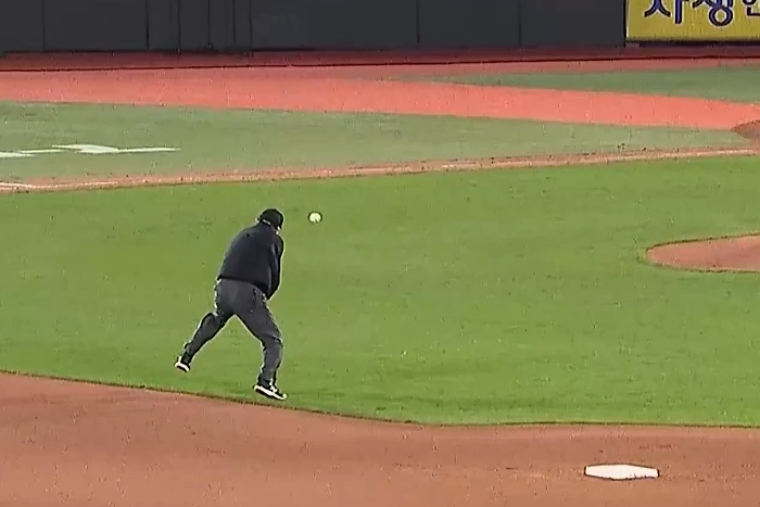 이 타구는 마운드 위에서 한 번 바운드한 다음 이 심판 몸에 맞았습니다.