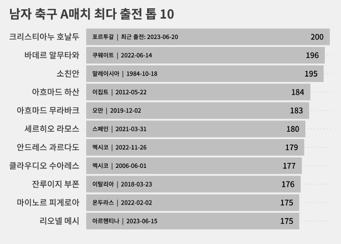 그밖에 총 26명이 A매치에 200경기 넘게 출전했습니다.