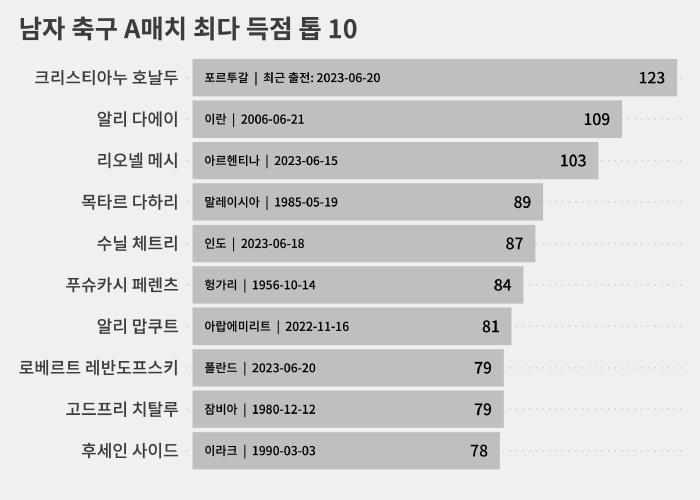 A매치 통산 득점 2위는 109골을 넣고 은퇴한 알리 다에이(54·이란)입니다.