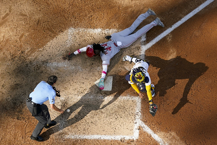 밀워키 3루수 브라이언 앤더슨(30)이 베이스 커버에 들어갈 새도 없이 데라크루스는 서서 3루를 밟았습니다.