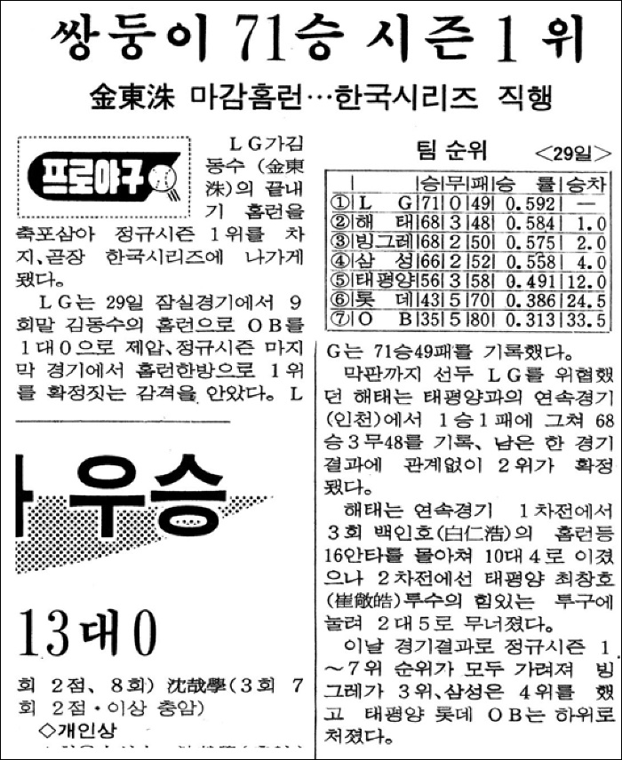 다만 인천 연속경기(더블헤더)에서 해태(현 KIA)가 태평양을 모두 이기면 LG가 우승을 확정할 수 없던 상황.