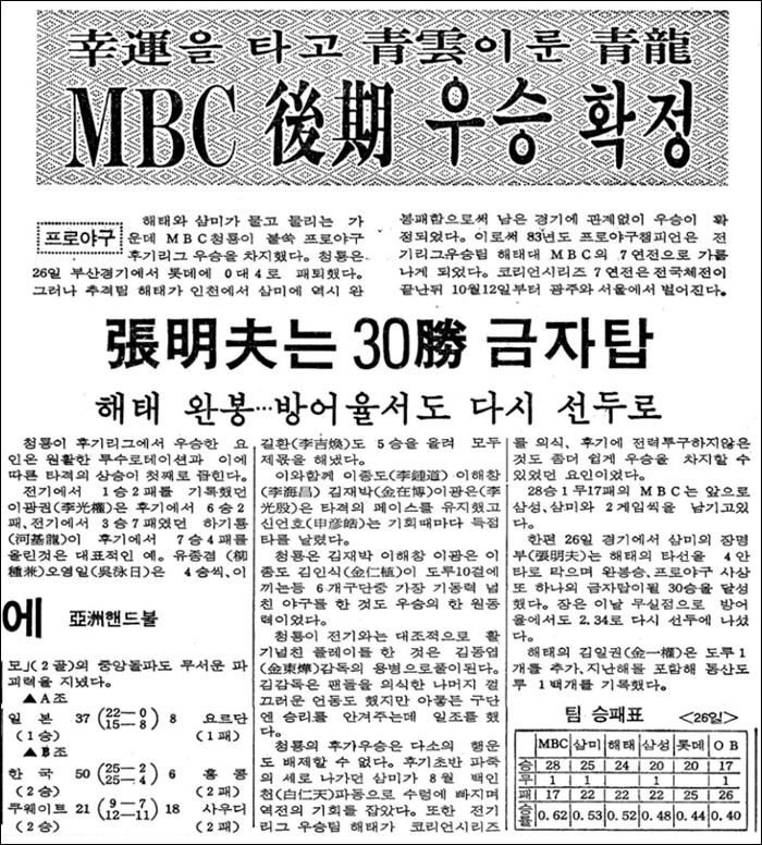 그러나 2위 팀 해태가 인천에서 삼미에 0-5로 패하면서 남은 경기 결과에 관계없이 후기리그 우승을 확정했습니다.