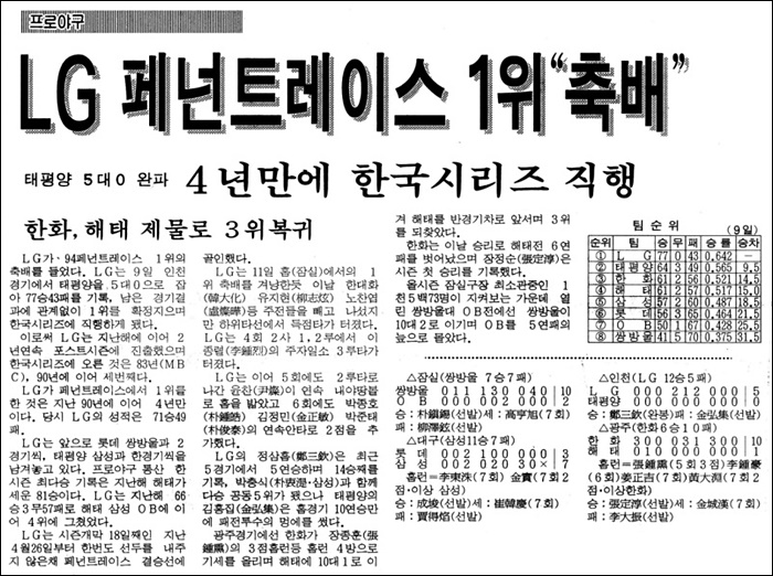 LG는 1994년 9월 9일 인천 경기에서 당시 2위 태평양을 5-0으로 물리치고 정규리그 우승을 확정했습니다.