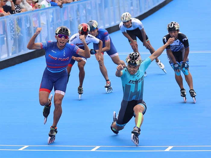 타이난(臺南)에서 열린 대회 남자 1000m 결선에서 선두로 달리던 황위린을 결승선을 통과하면서 두 손을 들어 올렸습니다.