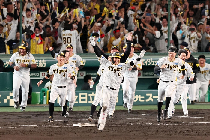 여기서 8번 타자 기나미 세이야(木浪聖也·29)가 '사요나라 안타'를 치면서 그대로 경기가 끝났습니다.