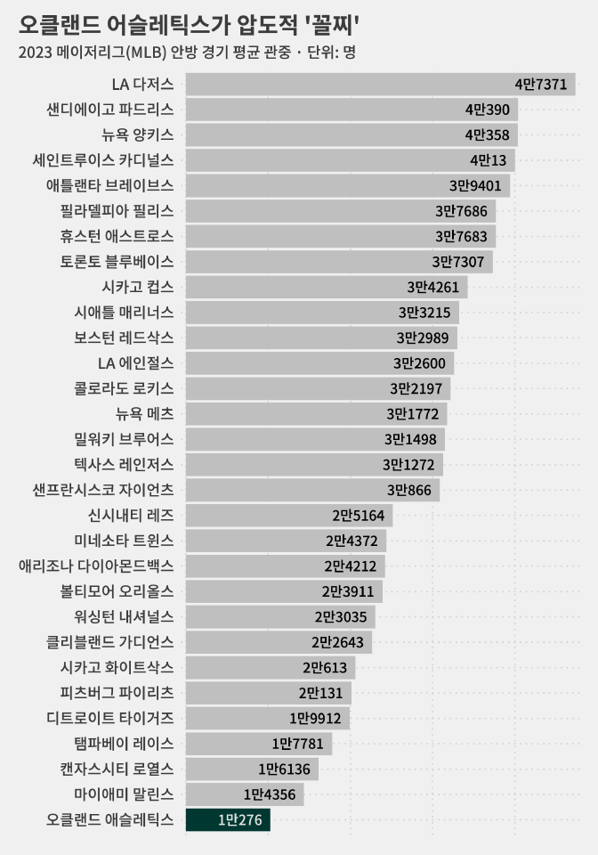 올해 오클랜드 콜로세움을 찾은 관중은 경기당 평균 1만276명으로 29위 그러니까 뒤에서 2등인 마이애미(1만4356명)와 비교해도 70%가 겨우 넘는 수준이었습니다.