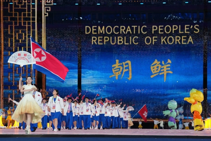 항저우(杭州) 아시안게임(아시아경기) 개회식에 입장하는 북한 선수단. 항저우=로티너 뉴스1