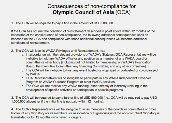 세계반도핑기구(WADA)가 아시아올림픽평의회(OCA)에 벌금 50만 달러(약 6억5000만 원)을 부과했습니다.