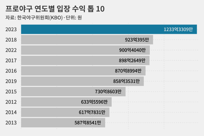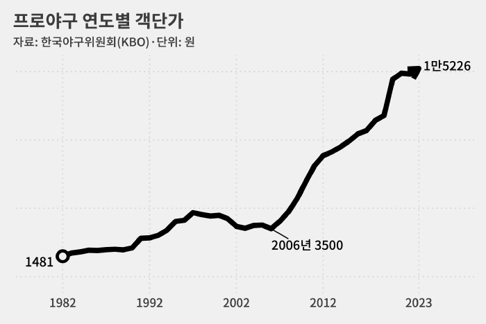 프로야구 원년인 1982년(1481원)과 비교하면 관중 1인당 입장 수익이 10배 이상 오른 겁니다.
