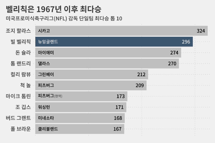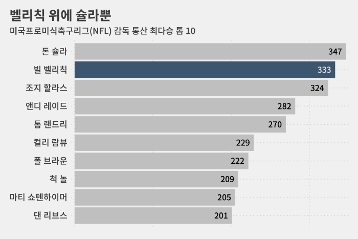 벨리칙 감독은 뉴잉글랜드에서 미국프로미식축구리그(NFL) 역대 최고라고 해도 손색이 없을 경력을 쌓았습니다.