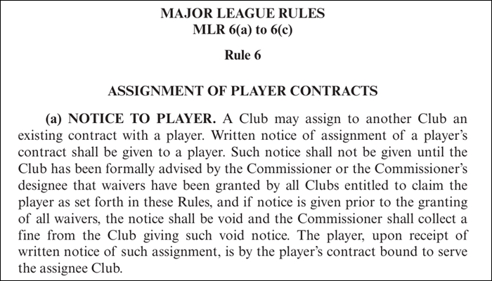 메이저리그 규약 제6장을 'ASSIGNMENT OF PLAYER CONTRACTS'를 읽어 보면 assignment가 어떤 뜻인지 알 수 있습니다.