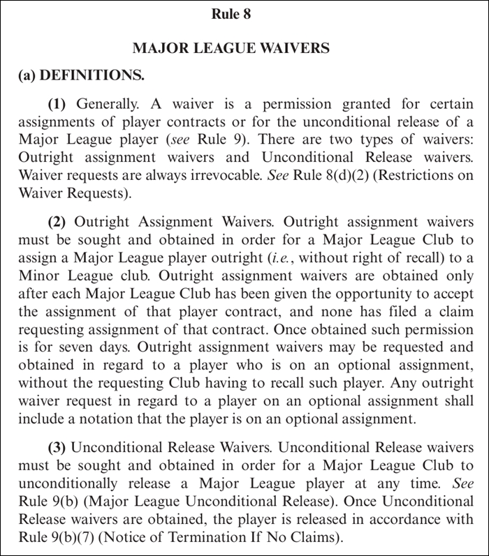메이저리그에는 '완전 양도 웨이버(outright assignment waivers)'와 '무조건 방출 웨이버(unconditional release waivers)' 두 종류가 있습니다.