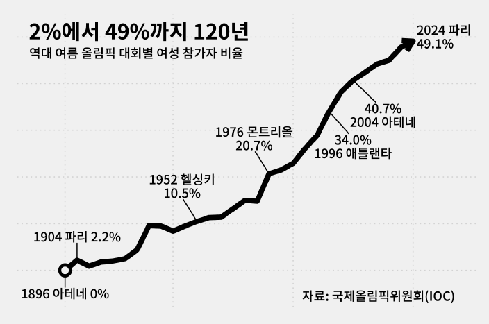 여자 선수에게 처음으로 올림픽 문호를 개방한 1900 파리 대회 때는 전체 참가 선수 997명 중 2.2%(22명)만 여자 선수였습니다.