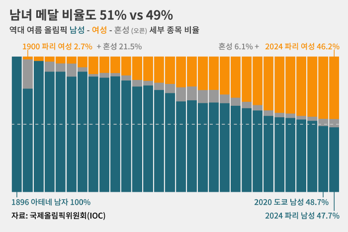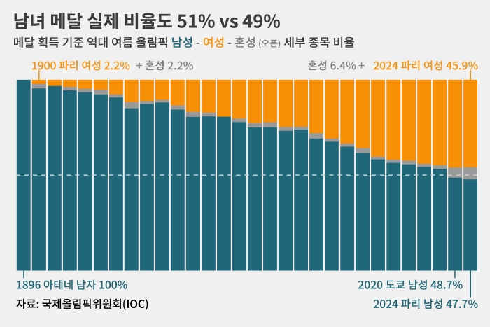 남자부 종목은 3년 전에 열린 2020 도쿄(東京) 대회 때 처음으로 50% 아래로 내려왔고 이번 파리 대회 때는 47.7%로 더 줄었습니다.