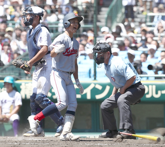 교토국제고는 10회말 1사 2, 3루 상황에서 유격수 땅볼 때 아웃 카운트와 점수를 맞바꾸면서 2-1로 쫓겼습니다.