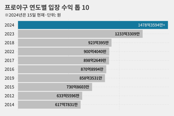 여기서 중요한 건 지난해 프로야구가 당시 기준으로 역대 3위, 현재 기준으로 4위에 해당하는 관중 810만326명을 불러 모았다는 점입니다.