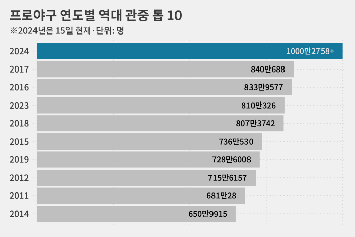한 시즌에 900만 관중이 몰린 적도 없는데 올해 바로 1000만 관중 시대를 열어젖힌 겁니다.