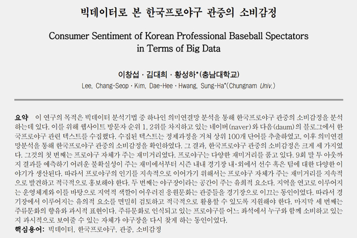 이 블로그에서 곧잘 인용하는 논문 '빅데이터로 본 한국프로야구 관중의 소비감정'은 △프로야구 자체가 주는 재밋거리 △야구장이라는 공간이 주는 유희적 요소 △주류문화의 향유와 과시적 표현에 주목합니다.