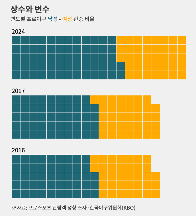 실제 KBO 조사에서도, 남성이 62.8%를 차지하는, 기존 야구팬 가운데 40.5%가 예년보다 관람 빈도가 늘었다고 답변했습니다.