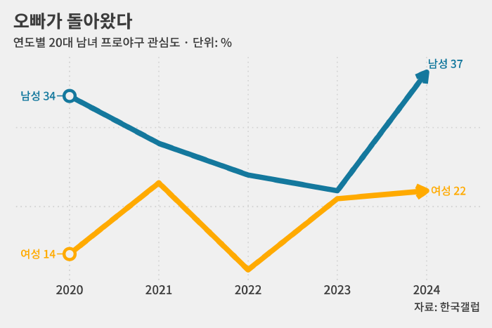 한국갤럽에서 해마다 진행하는 '프로야구에 대한 여론조사'에 따르면 20, 30대 남성 가운데 '프로야구에 관심이 있다'고 답한 비율은 지난해 26.7%에서 올해 40.3%로 올랐습니다.