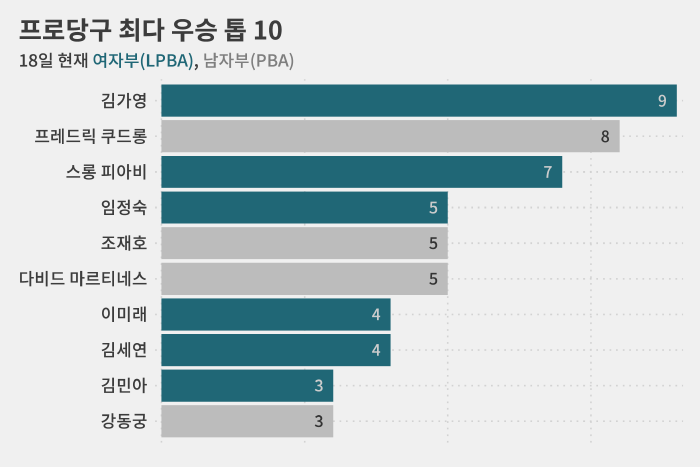 이전에는 '당구 황제' 프레데릭 쿠드롱(56·벨기에)가 남자부(PBA)에서 8번 정상에 오른 게 남녀부 합산 최다 우승 기록이었습니다.