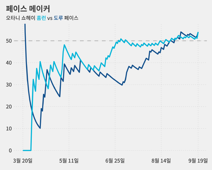 오타니는 팀이 시즌 반환점을 돈 6월 25일까지 24홈런-16도루로 48홈런-32도루 페이스를 기록하고 있었습니다.