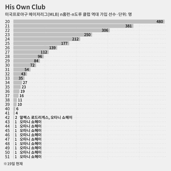 메이저리그(MLB)는 물론 한국이나 일본 프로야구를 통틀어 50홈런-50도루 클럽 회원은 오타니 한 명밖에 없습니다.