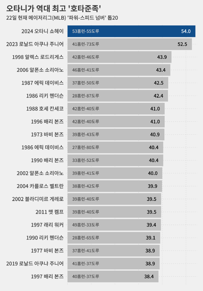 그러다 오타니가 21일 경기까지 52홈런-53도루를 기록하면서 아쿠냐 주니어(52.5)와 동률을 이뤘습니다.