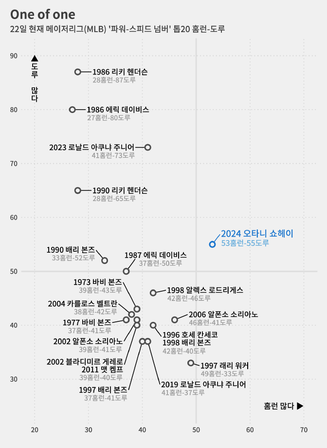 그러다 오타니가 21일 경기까지 52홈런-53도루를 기록하면서 아쿠냐 주니어(52.5)와 동률을 이뤘습니다.