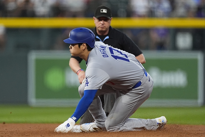 오타니는 27일(현지시간) 메이저리그(MLB) 콜로라도 방문 경기 2회초 1사 1, 2루에서 우전 적시타를 치고 1루를 밟았습니다.