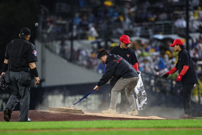 그러다 삼성이 1-0으로 앞서가던 6회초 무사 1, 2루 상황에서 빗줄기가 다시 굵어지기 시작했습니다.