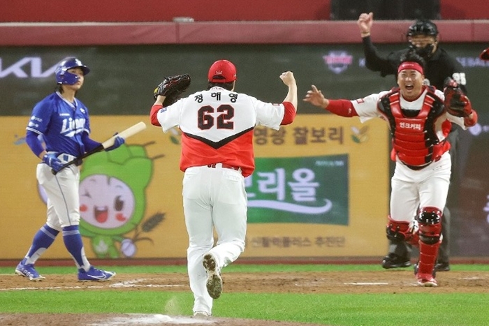 KIA 마무리 투수 정해영(23)이 삼성 1번 타자 김성윤(25)을 헛스윙 삼진으로 돌려세우면서 2024 프로야구 한국시리즈가 막을 내렸습니다.