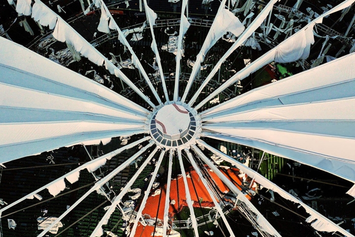 허리케인 '밀턴'이 유리 섬유로 만든 지붕을 날려 버린 메이저리그 탬파베이 안방 구장 트로피카나 필드가 이런 상황입니다.