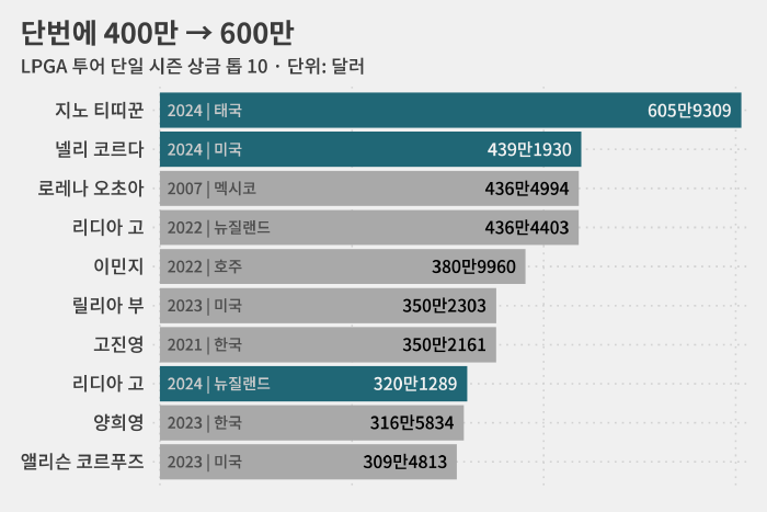 한국 선수 가운데는 △유해란(23·다올금융그룹·5위) △양희영(35·후원사 없음·12위) △고진영(29·솔레어·13위) △임진희(26·안강건설·18위) △최혜진(25·롯데·22위) △김아림(29·한화큐셀·23위) △김세영(31·메디힐·29위) △안나린(28·메디힐·32위) 등 8명이 100만 달러를 넘었습니다.