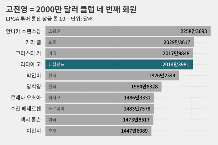 LPGA 투어 역사상 통산 삼금 2000만 달러를 넘긴 건 리디아 고가 네 번째입니다.