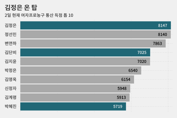 김정은 통산 8139점을 기록한 채 2일 삼성생명 상대 부천 안방 경기를 시작했습니다.