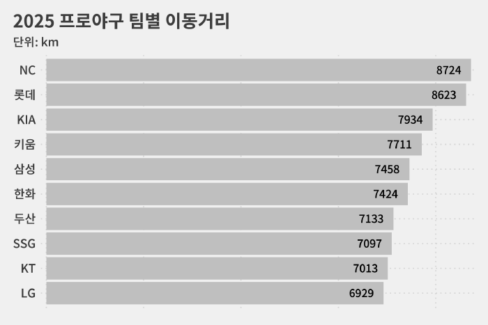 현재 발표 일정 기준으로 올해 가장 먼 거리를 이동해야 하는 팀은 NC(8724km)입니다.