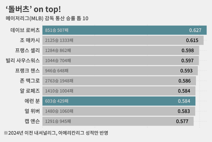 (니그로 리그 기록을 제외하면) MLB 역사상 로버츠 감독보다 통산 승률이 높은 사령탑은 없습니다.