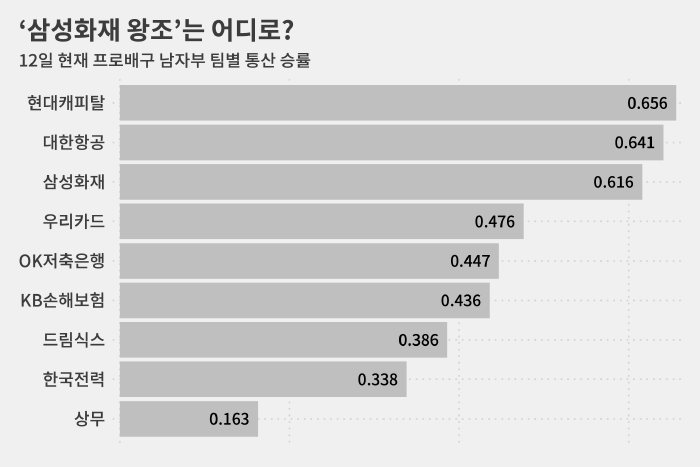 이로부터 49개월이 지난 현재 삼성화재(.616)는 대한항공(.641)에도 통산 승률이 뒤진 상태입니다.
