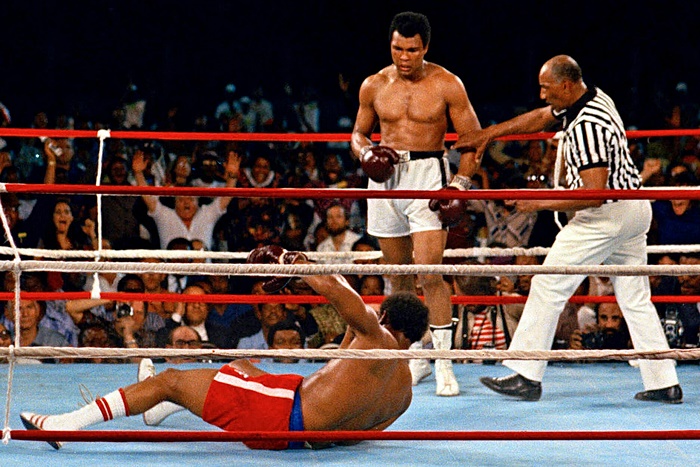 알리는 이 틈을 놓치지 않고 좌우 원투 펀치를 날렸고 포먼은 KO패를 당하게 됩니다.