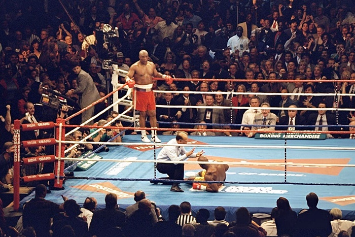 포먼은 35전 전승을 기록 중이던 마이클 무어러(58)를 상대로 WBA, IBF 통합 타이틀 매치를 치렀고 10라운드 KO승을 거뒀습니다.