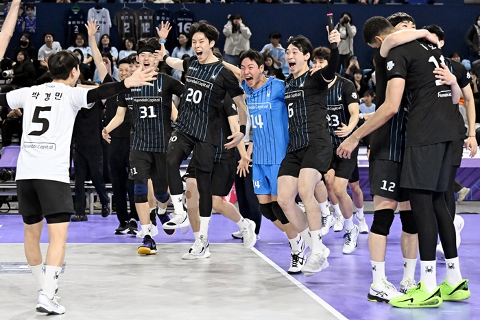 현대캐피탈이 '쿼드러플 디펜딩 챔피언' 대한항공을 실속 상태에 빠뜨리면서 프로배구 남자부 최정상까지 올랐습니다.