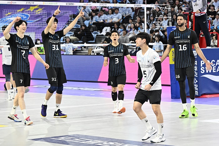 현대캐피탈은 5일 인천 계양체육관에서 열린 챔프전 세 번째 경기에서 대한항공을 3-1(25-20, 18-25, 25-19, 25-23)로 물리치고 3전 전승으로 시리즈를 끝냈습니다.