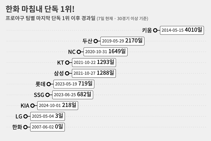 한화가 6549일 만에 단독 1위가 되면서 이제 키움이 단독 1위에 오른 지 가장 오래된 팀이 됐습니다.