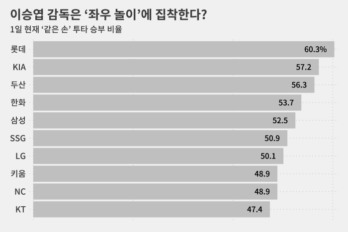 새 투수가 마운드에 올랐을 때 같은 손 승부 비율 역시 △롯데 67.5% △KIA 61.0% △두산 60.0% 순서였습니다.